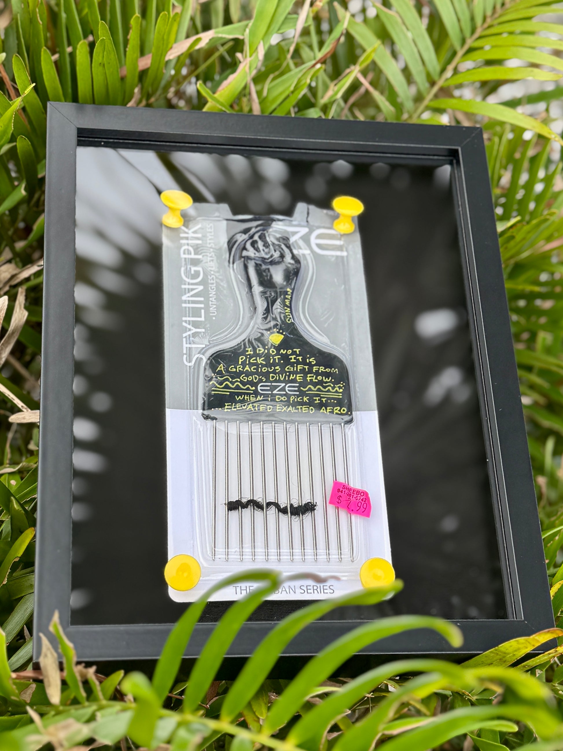 Pick Me! 1:1 original poem hand written by Sun Man on a beauty supply pick with an acrylic pen. One natural sun kissed Sun Man coil is woven into the story. Certificate of authenticity included. Shadow Box 11.25 inches x 9.25 inches.